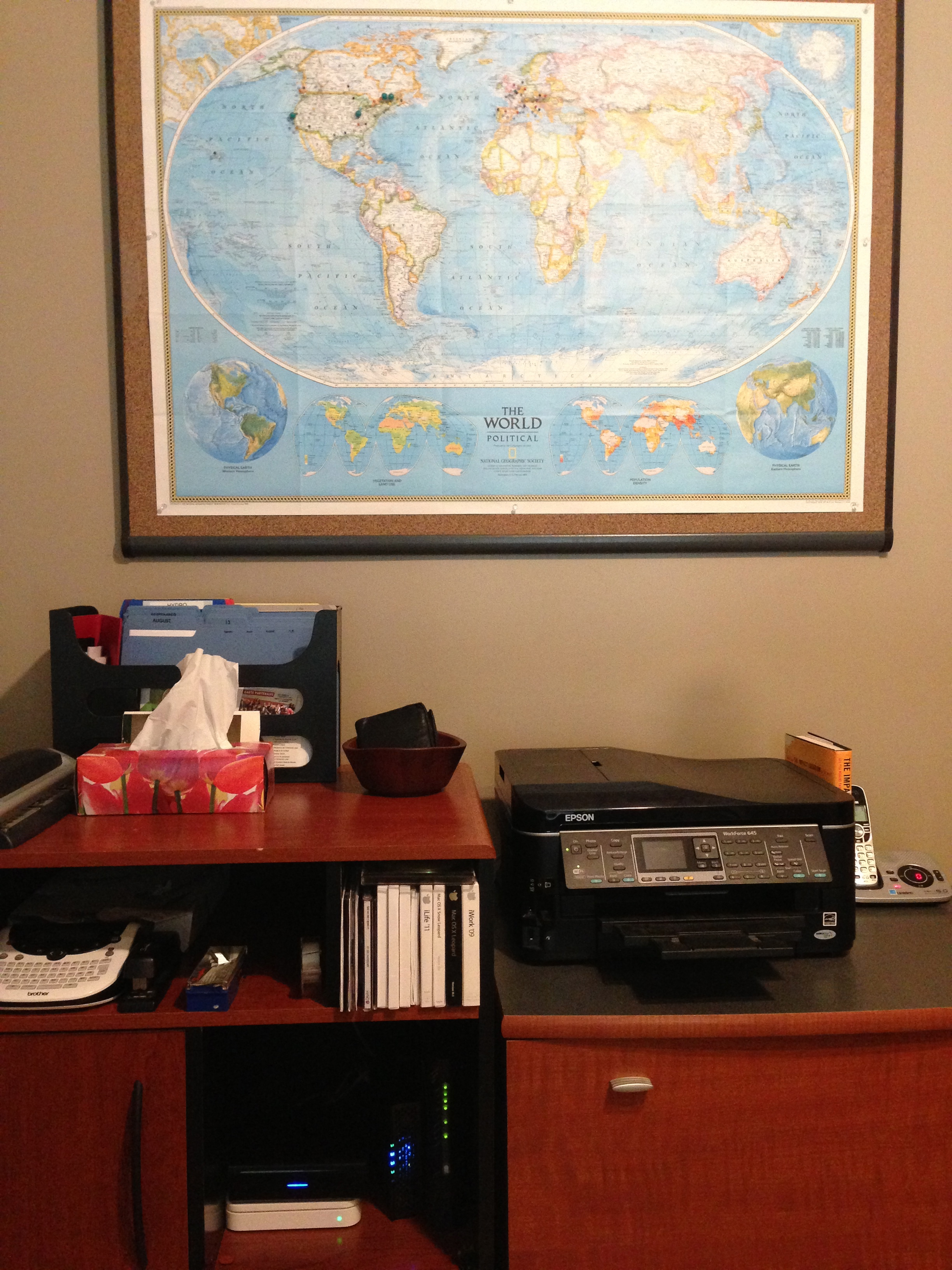 I quickly got interested by simple designs made of a single, large wooden table top. This gives an effective work space that is sizeable. Further, in today digital world, things like the Wi-Fi box and printers do not need to be right by the computer. My basement has suspended panel ceiling, this also means that I can get Cat5e cables anywhere in the house easily. In fact, I have been streaming family photos and videos to my PS3 for many years now.