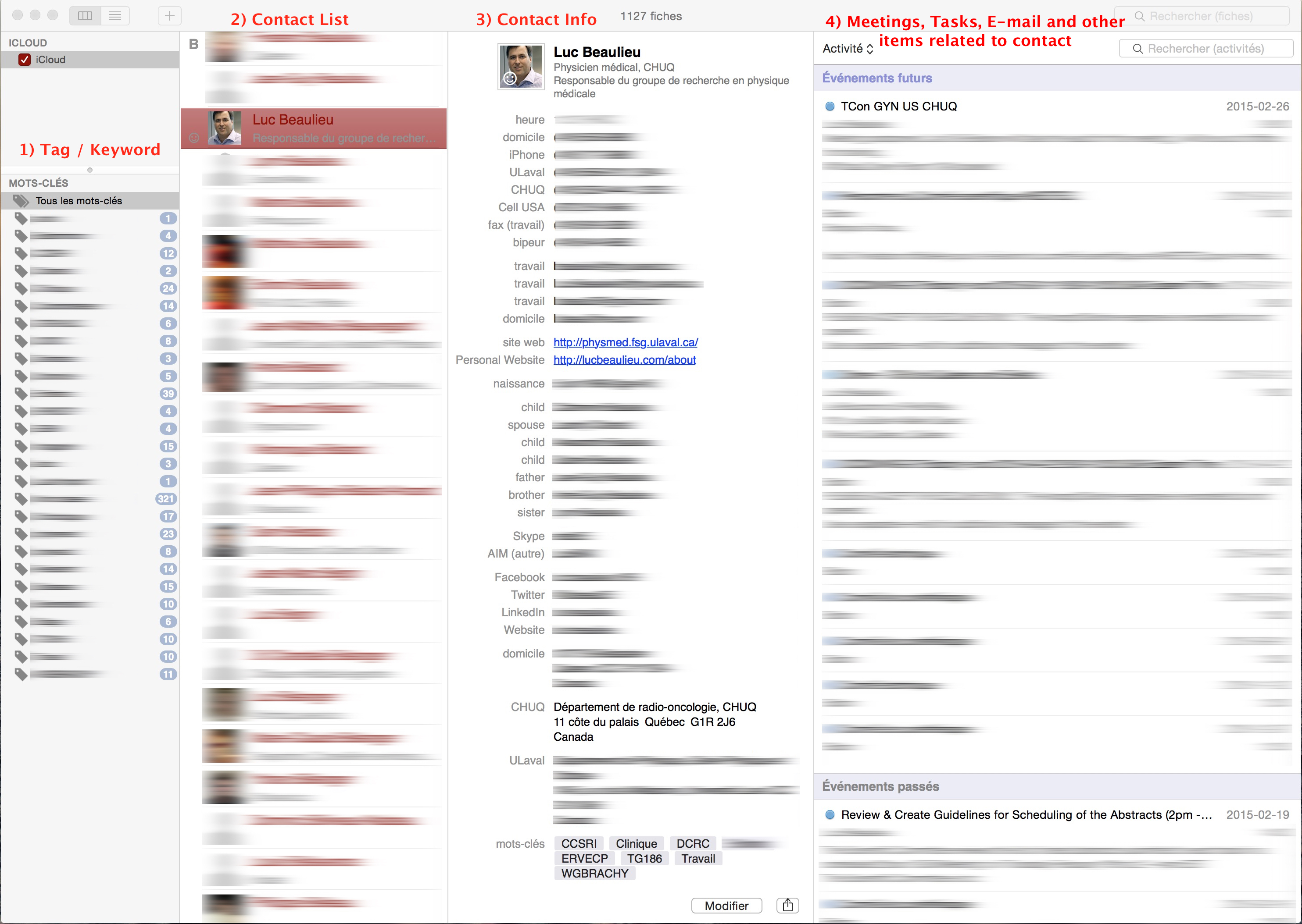 First time running the app, you will be guided to guided via the set-up assistant to access your contacts and so on. BusyMac have an excellent Getting Started guide. All of your various mailing lists inside Contacts will appear as Tags or Keywords (see Item 1 in the image below) in BusyContacts and individual contact (zone #2) will inherit all Tags or Keywords it was associated to in Apple Contacts (see at the bottom of column 3 below – “mot-clés” in French!).