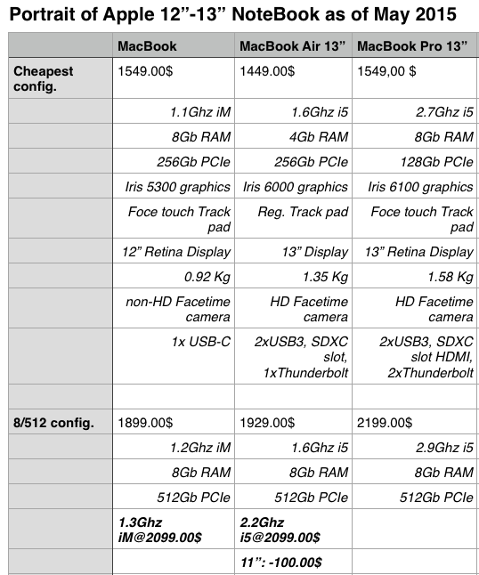 It is also interesting to look at the pricing scheme of Apple notebook lineup. In particular comparing the new 12″ MacBook, 13″ Air and 13″ Pro Retina. The table below gives some of the key components and price (in Canadian dollars).