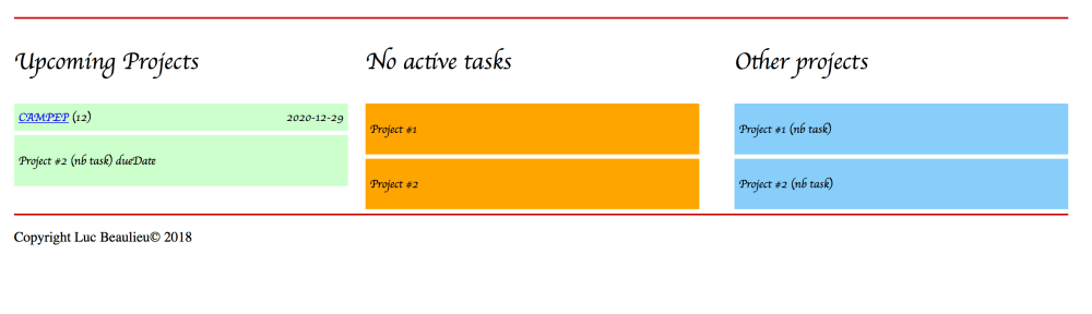 box1 is the style for the left most box in the CSS file and rowProj is my tuple, containing the information I need out of the Things database. Having everything inside Python (except for the CSS file) make everything nice and easy. Now, putting it all together gives the Kanban-view shown below: