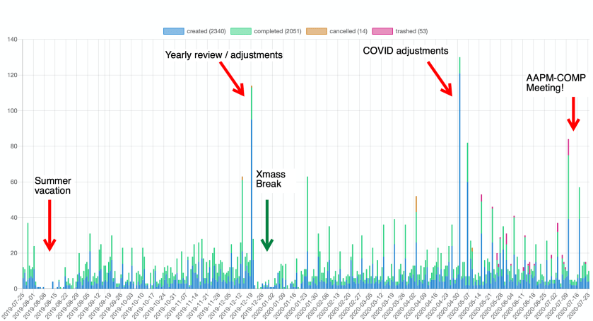 - In the summer (August – as well as the peak in July just before vacation, this year coinciding with the joint AAPM/COMP meeting, to make sure nothing is left in my head before leaving!)