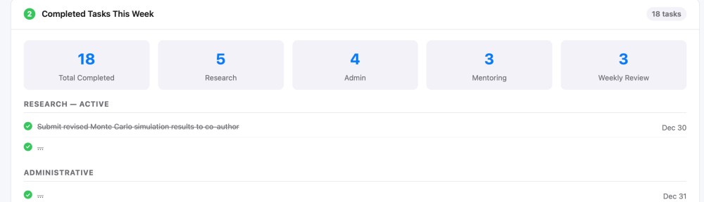 Section 2 — Completed Tasks This Week. Every reminder marked as done during the past seven days, grouped by list, with summary statistics showing which domains consumed the most effort. This is the “what did I actually accomplish” mirror, surprisingly motivating on weeks when it felt like nothing moved forward.