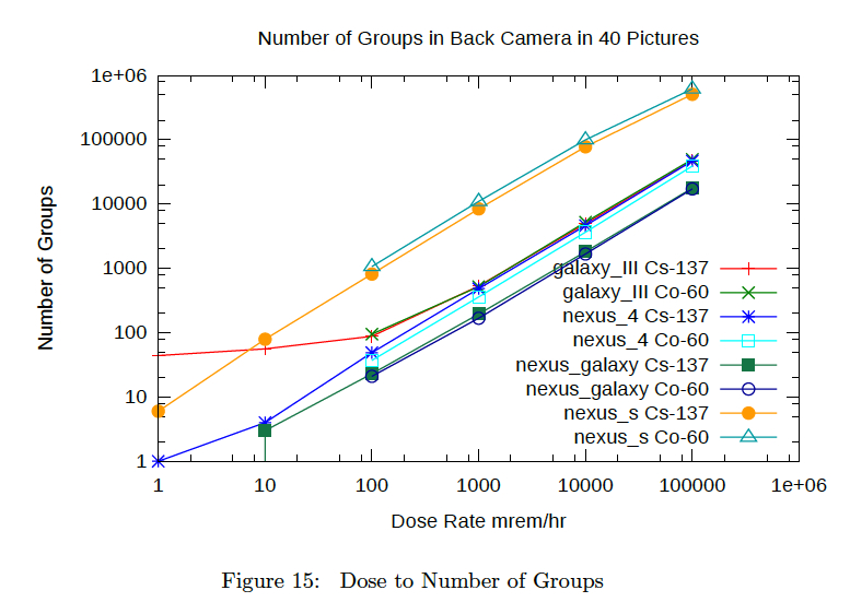 A recent paper by Joshua J. Cogliati, Kurt W. Derr, Jayson Wharton entitled “Using CMOS Sensors in a Cellphone for Gamma Detection and Classification”, and freely available on arXive, is demonstrating this of high energy gamma radiation and various Samsung. The idea is that when high energy photons (gamma radiations) hit the sensors, it generate high energy electrons that will leave fire the CMOS (or CCD) pixels that would otherwise have no signals. The produce “tracks” and the numbers of these tracks are representative of the amount of radiation measured by the device. This is shown on the figure above, Fig. 15 of that manuscript.